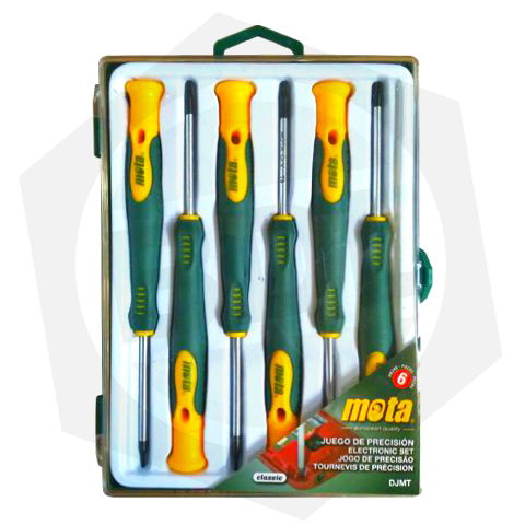 Juego de destornilladores de precisión perilleros en estuche de plástico. Punta tratada, uso profesional. Incluye T5, T6, T7, T8, T9, T10 x 50 mm de largo.